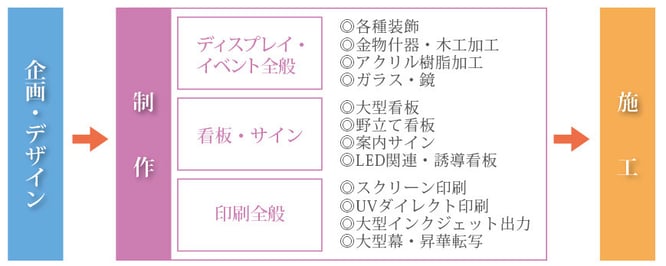 サインや販促物は、企画・制作から施工まで一貫して行っております。このことは、お客様に手間をとらせずに作業を遂行できるため、ひいては時間のロスを減らし低コストの実現にもつながります。